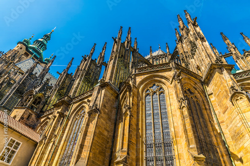 A view showing the decoration on the side of the Saint Vitus Cathedral in the castle complex in Prague in springtime