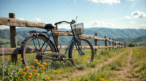 A vintage bicycle leaning against a rustic wooden fence in a sunlit countryside. Wildflowers in bloom surround the bike, and distant rolling hills stretch under a bright blue sky.