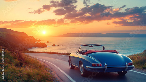 A vintage blue convertible car drives along a coastal road at sunset, capturing the beauty of nature and freedom.