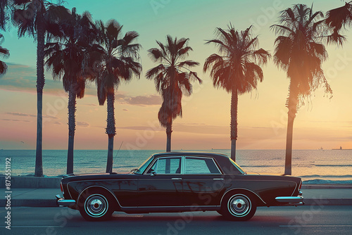 A vintage car parked by the palm-lined beach at sunset, creating a nostalgic and serene atmosphere of leisure and travel.