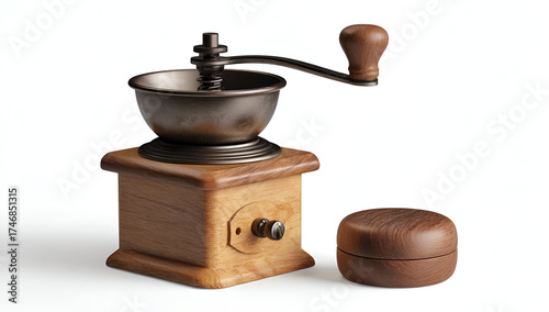 A vintage coffee grinder made of wood and metal, showcasing intricate design and craftsmanship.