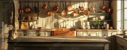 A vintage farmhouse kitchen with a large island, an apron sink, and racks hanging with copper pots, bathed in the glow of early morning light