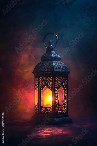 A vintage lantern on the ground, illuminated with red and blue hues, set against a dark backdrop, evoking a mysterious and eerie ambiance, reminiscent of a autumnal celebration, in an unspecified loca