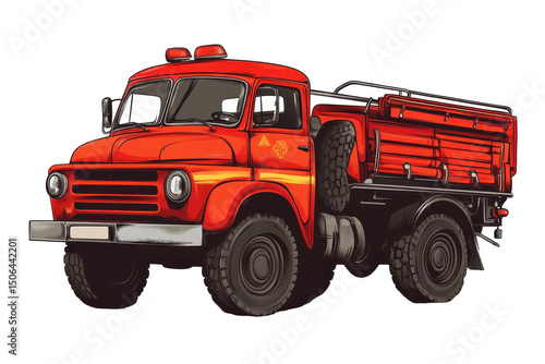 A vintage red firetruck, robustly built, detailed illustration showcasing its weathered yet functional design