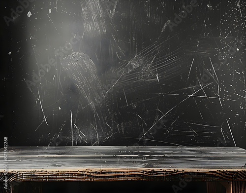 A vintage scratched black chalkboard background with a rustic tabletop offering ample copy space, ideal for mock-ups, back to school themes, and educational designs.