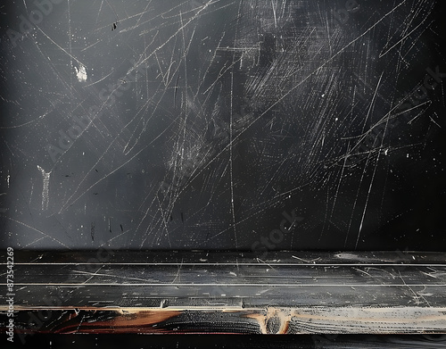 A vintage scratched black chalkboard background with table top for mock up your products or design, back to school concept, copy space available.