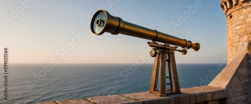A vintage telescope overlooking a breathtaking seascape at sunset, symbolizing exploration and adventure in nature.