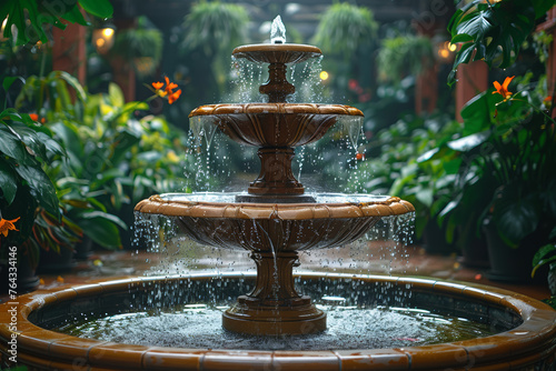 A vintage watering fountain surrounded by lush greenery, enhancing the garden with a soothing water feature. Concept of integrating aesthetics and functionality. Generative Ai.
