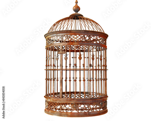 A vintage wooden birdcage with intricate carvings and a domed top.
