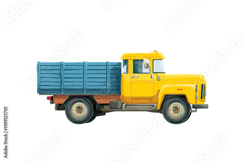 A Vintage Yellow and Blue Flatbed Truck Illustration Isolated on transparent background, cutout