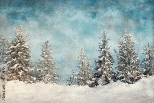 A vintage-inspired snowy landscape with a row of snow-covered fir trees against a blue sky.