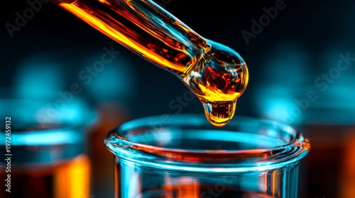 A viscous amber liquid droplet falling from a glass pipette into a laboratory beaker, showcasing scientific experimentation and precision.
