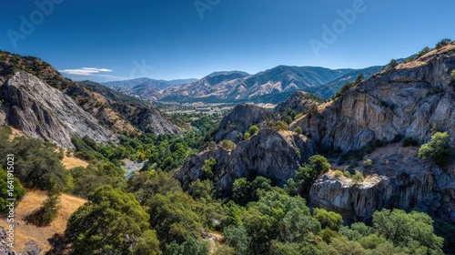 canyon, sky, brown, greenery, green, forest, mountain, beautiful, vibrant, sunny, elevation, view, lush, high, granite, rock, wide, dramatic, vale, summer, tree, hill, sunlight, foliage, landscape, river, detailed, blue, nature, panorama, mountainous, rock, natural, scenic