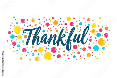 A visually appealing design featuring the word "Thankful" in a stylish handwritten font, surrounded by multicolored glossy dots in shades of yellow, pink, and blue on a white background.