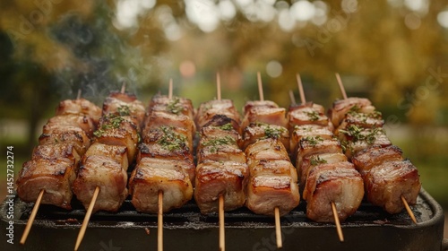 A visually appealing display of pork belly skewers on a grill, with smoky char marks and fresh herbs, set against a blurred outdoor background.