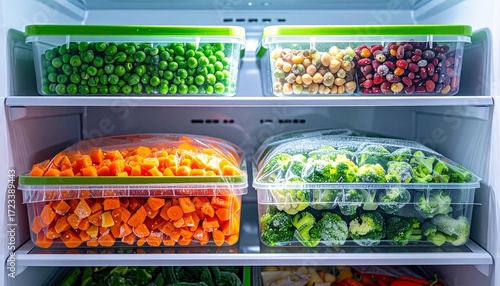 A visually appealing image showcasing organized containers filled with fresh frozen vegetables, including peas, berries, carrots, and broccoli, ready for storage