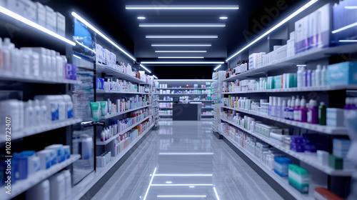 A visually appealing pharmacy aisle lined with various medicine packages, creams, and wellness products, catering to customers’ diverse healthcare requirements in a clean, organize