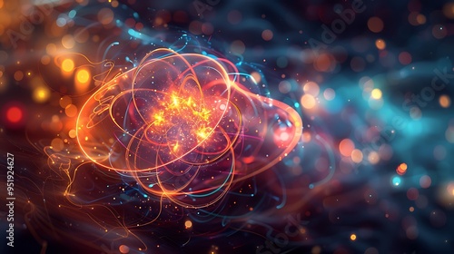 visually, rich, scientific, illustration, that, quantum, mechanic, nuclear, fission, showing, wave, function, particle, interaction, energy, state, rendered, colourful, abstract, shape, convey, complexity, atomic, physics