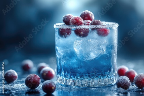 A visually striking blue cocktail with ice, garnished with frosted cranberries and a sugared rim, set against a cool, dark background.