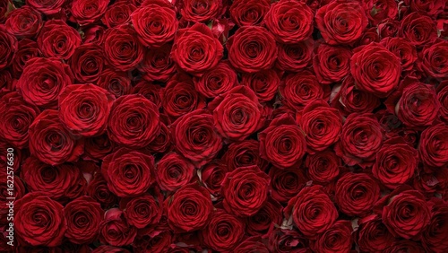 A vivid display of scarlet roses, showcasing their intricate charm and romantic essence in a detailed close-up, ideal for weddings and Valentine's celebrations.