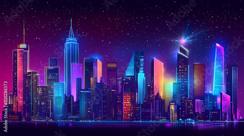 A vivid neon cityscape beneath a starry digital sky, showcasing tall skyscrapers and bustling urban life, representing human advancement and technological progress. Starry. Illustration