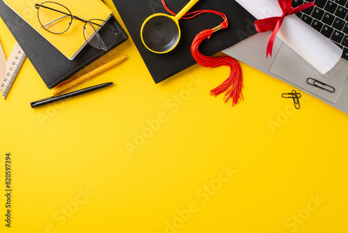 A vividly colored setup displays graduation essentials including a tassel, diploma, spectacles, and notebook on a bright yellow surface