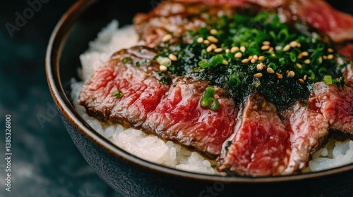 A wagyu beef rice bowl served on a dark, moody background with soft, dramatic lighting