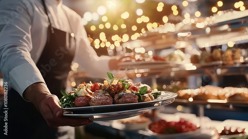 A waiter presenting a gourmet dish with roasted vegetables, meat, and sauce on a white plate in a fine dining restaurant, creating an elegant and inviting atmosphere