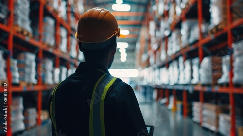 A warehouse worker in a hard hat and safety vest walks down an aisle of stacked boxes.