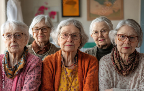 A warm and friendly group of elderly women, each with glasses, pose indoors in a cozy environment, showcasing the beauty of friendship and experience in later years.