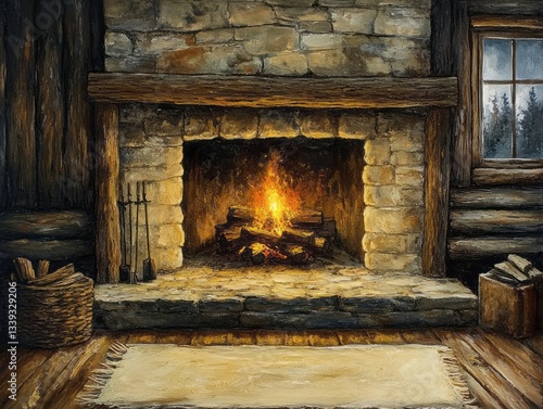 fire, fireplace, wood, log, flames, stone, brick, chimney, hearth, warm, cosy, rustic, cabin, home, interior, room, basket, tool, holder, rug, floor, wooden, beam, texture, light, glowing, burning, comfort, winter, season, tranquil, peaceful, relaxation, night, evening, scene, window, view, landscape, nature, forest, outdoors, cold, darkness, shelter, wall, stack