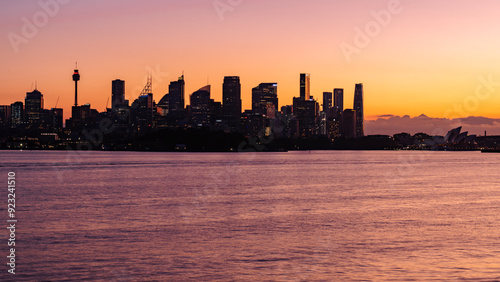 A warm and vibrant sunset glow is seen against a silhouetted cityscape across the harbour.