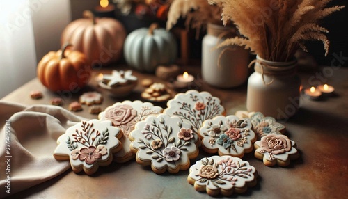 autumn, cookie, pumpkin, dried, plant, warm, still life, decorated, floral, pattern, cosy, seasonal, decor, fall, colours, beige, tone, candle, ambience, comfort, festive, harvest, celebration, rustic, style, homelike, vibe, artistic, edible, treat, hand-made, icing, detailed, craftsmanship, culinary, artistry, foliage, wheat, bokeh, depth, natural, element, indoor, photo