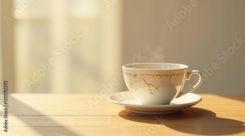 A warm beverage in a delicate teacup rests on a wooden table, bathed in the gentle glow of sunlight streaming through a nearby window.
