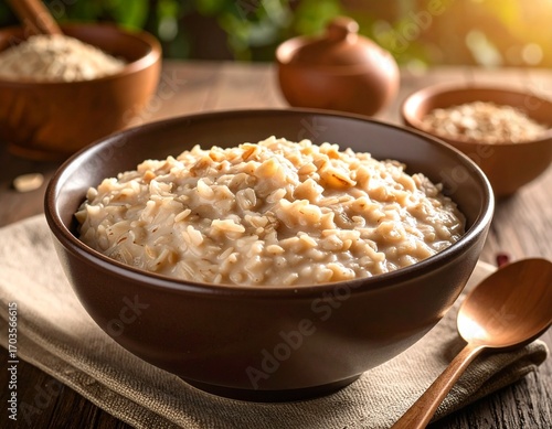A warm bowl of cooked oatmeal on a rustic wooden table, with a spoon and other bowls in the background. Natural light creates a cozy morning breakfast scene.