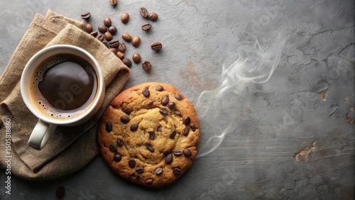 A warm cup of coffee with a freshly baked chocolate chip cookie, steaming on a rustic stone background.