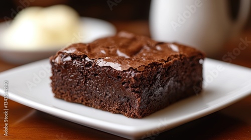 A warm, fudgy chocolate brownie, its edges golden brown and its center oozing molten chocolate.