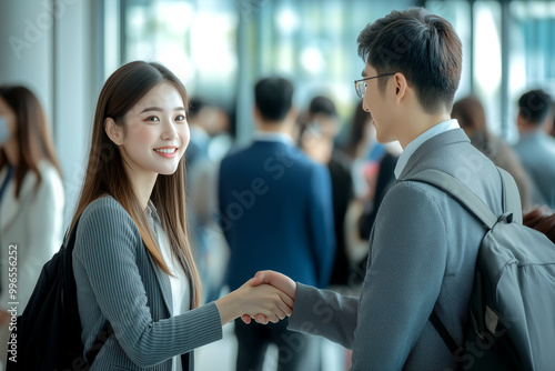 A warm handshake between a smiling woman and a man during a formal gathering in a city building, promoting unity and collaboration.