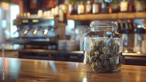 A warm, inviting cafe scene with a glass jar filled with cannabis buds resting on a wooden counter, bright sunlight streaming inside.