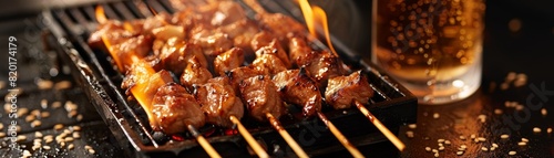 A warm, inviting scene of yakitori skewers on a small charcoal grill, flames gently touching the marinated meat, with a glass of cold beer beside it