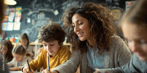 A warm, supportive female teacher assists young male student with his writing at a desk in a lively classroom. Concept of attention, effective teaching, and a positive learning environment.