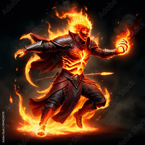 A warrior engulfed in flames, his armor glowing with fire. His eyes gleam with determination, and his hand is ablaze with power.