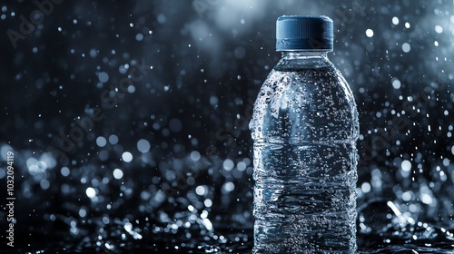 A water bottle covered in condensation, with water droplets in the background.