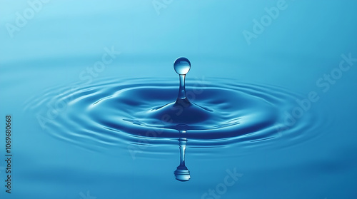 A water drop falling into calm water creating ripples and reflections on a blue surface.