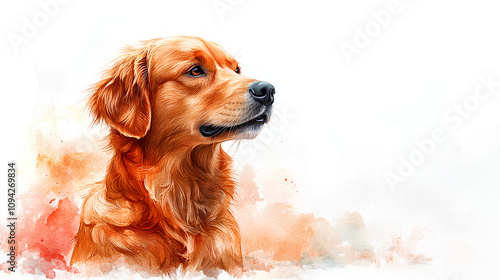 A watercolor golden retriever looking over its shoulder playfully, painted on a white background