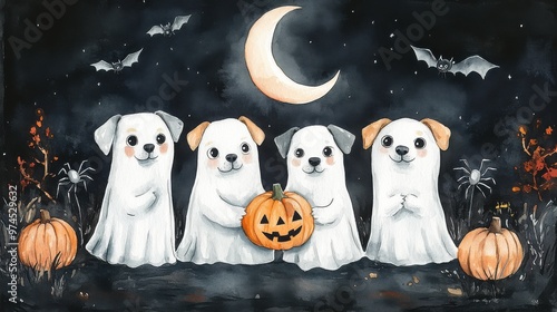 A watercolor illustration of four dogs in ghost costumes, with one holding a pumpkin, set against a simple dark background with a crescent moon, bats, and spiders.