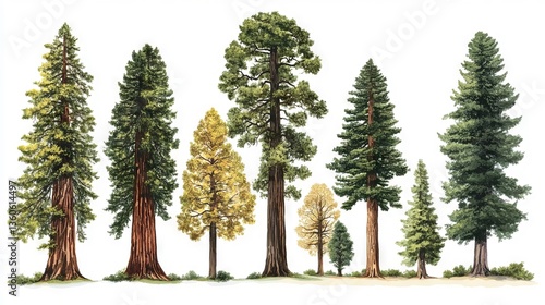 tree, sequoia, watercolor, illustration, foliage, conifer, evergreen, tall, giant, trunk, bark, branch, needle, yellow, green, autumn, spring, forest, grove, wood, nature, botanical, artwork, majestic, isolated, drawing, flora, seasonal, texture, detailed, slender, lush, diverse, pyramidal, aged, vintage, realistic, scenic, timberland, ecological