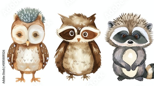 owl, raccoon, hedgehog, watercolor, cute, adorable, animal, wildlife, forest, timberland, nature, art, illustration, design, baby, children, childcare center, children, pattern, set, collection, character