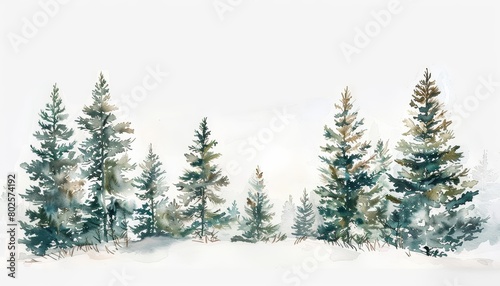 A watercolor painting of a minimal scene of snowcovered pine trees, serene and quiet, on a white background