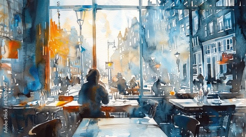 A watercolor painting of a person sitting in a cafe, looking out at a busy street.